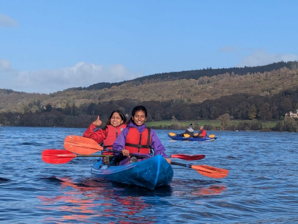 Kayaking is a great way to get independence on the lake; we have single person and two person options. We will often go for a journey, get a good view, learn some new skills, and play some games. Our kayaks turn more easily than our canoes making them more agile and speedy, this means we may spend a bit longer covering basic skills and how to make your boat go where you want it to. It also means that it is a good idea to wear a wetsuit for kayaking.